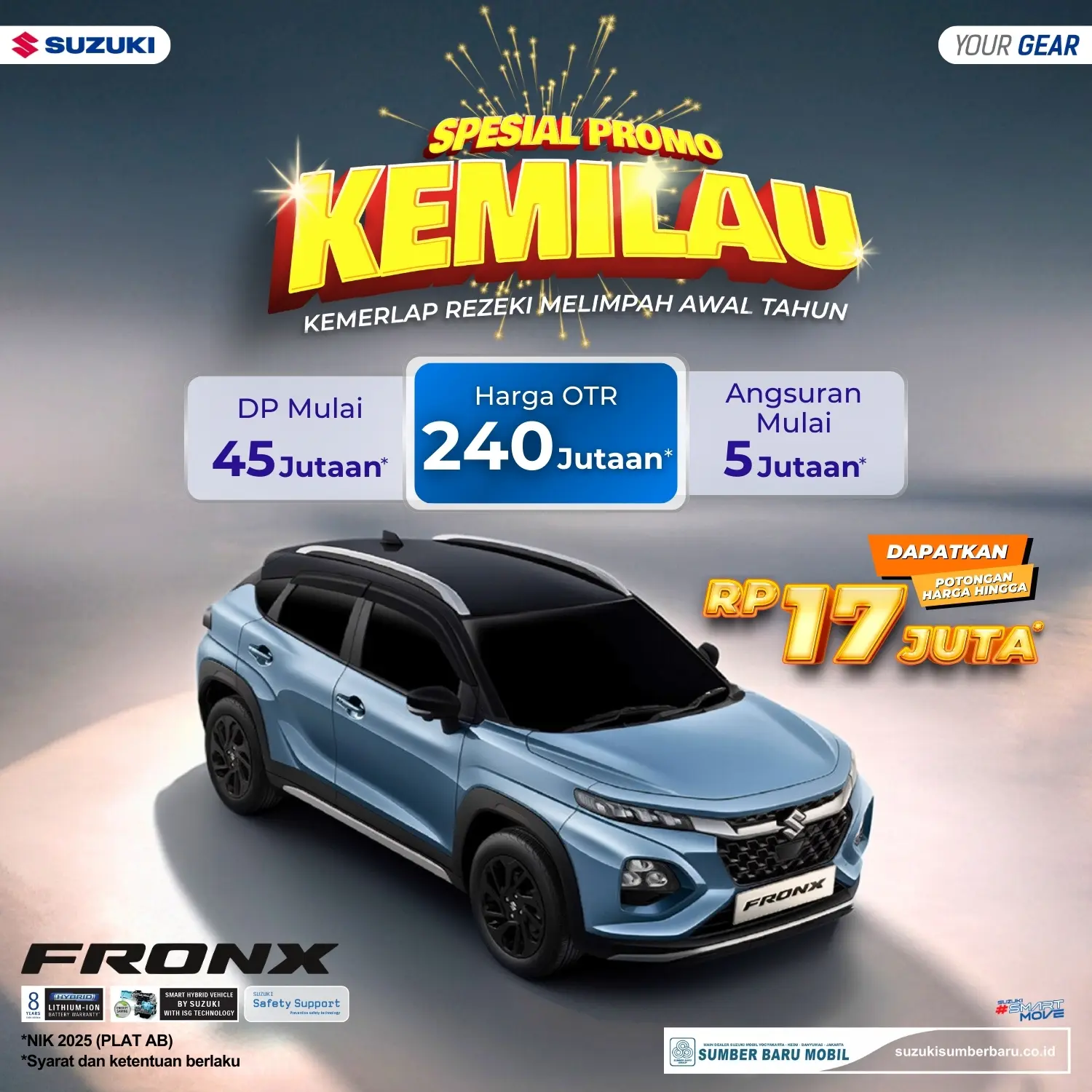 "Saya sangat terbantu dengan promo di Suzuki Magelang ini. Awalnya cari mobil yang kuat buat jalanan Magelang tapi tetap irit bensin. Setelah ambil Fronx lewat Promo Kemilau, cicilannya sangat ringan dan pelayanannya luar biasa ramah!" — Bapak Slamet, Wirausahawan di Magelang.