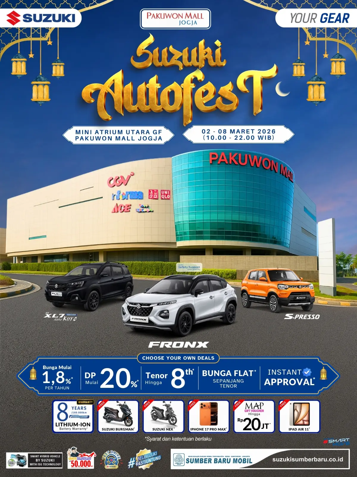YOGYAKARTA – Awal Maret 2026 dibuka dengan promo yang sangat menggoda bagi warga Yogyakarta dan sekitarnya. Suzuki Sumber Baru Mobil kembali menggelar ajang bergengsi Suzuki Autofest yang berlangsung di Mini Atrium Utara GF, Pakuwon Mall Jogja. Pameran otomotif terbesar ini hadir mulai tanggal 02 hingga 08 Maret 2026, pukul 10.00 - 22.00 WIB. Promo ini adalah kesempatan langka untuk memiliki unit favorit seperti Suzuki Fronx, Jimny, XL7 Hybrid, hingga Grand Vitara dengan penawaran yang sulit ditolak.
