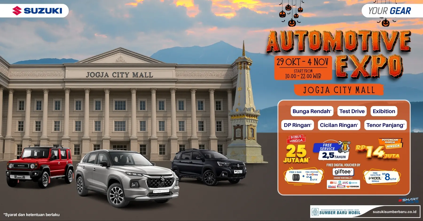Yogyakarta – Suzuki Sumber Baru Mobil kembali menghadirkan pameran otomotif spesial bertajuk “Suzuki Automotive Expo” yang berlangsung di Jogja City Mall mulai 29 Oktober hingga 4 November 2025, pukul 10.00–22.00 WIB.