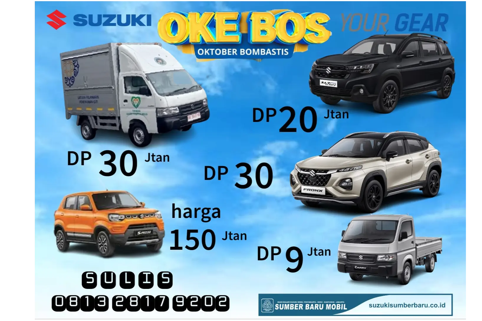 Bantul, Agustus 2025 – Rayakan kemerdekaan dengan promo menarik dari Suzuki Bantul Sumber Baru Mobil! Kini beli mobil Suzuki makin ringan dengan penawaran DP mulai dari 5 jutaan dan kemudahan bayar cash 2x untuk berbagai tipe andalan seperti Fronx, XL7, Ertiga, Carry, dan Spresso.