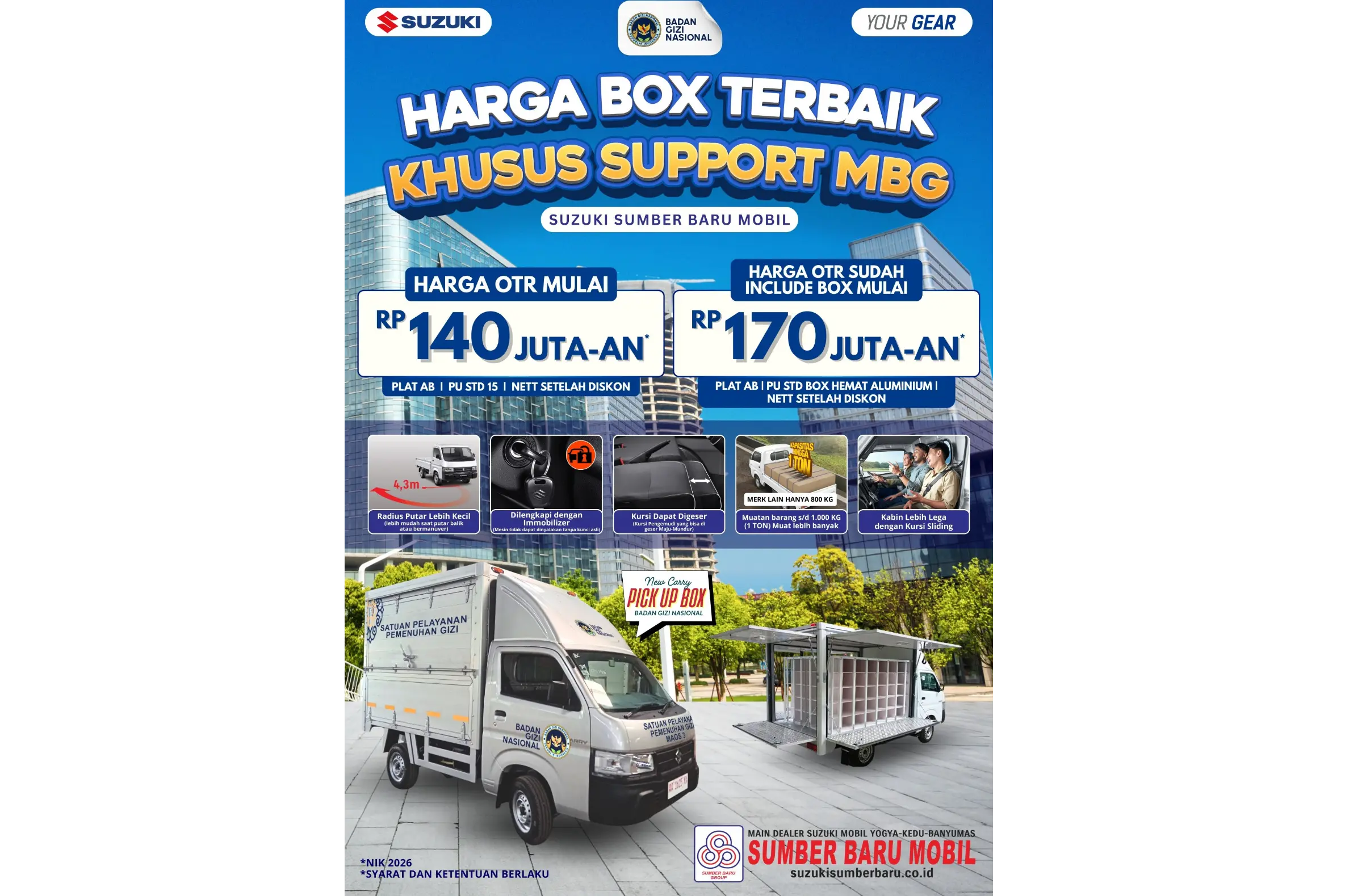 CILACAP – Dalam upaya menyukseskan program nasional Satuan Pelayanan Pemenuhan Gizi, Suzuki Cilacap Sumber Baru Mobil resmi memperkenalkan armada unggulan New Carry Pick Up Box NIK 2026. Kendaraan ini hadir sebagai solusi distribusi logistik pangan yang efisien dan tangguh untuk menjangkau seluruh lapisan masyarakat di wilayah Cilacap dan sekitarnya.