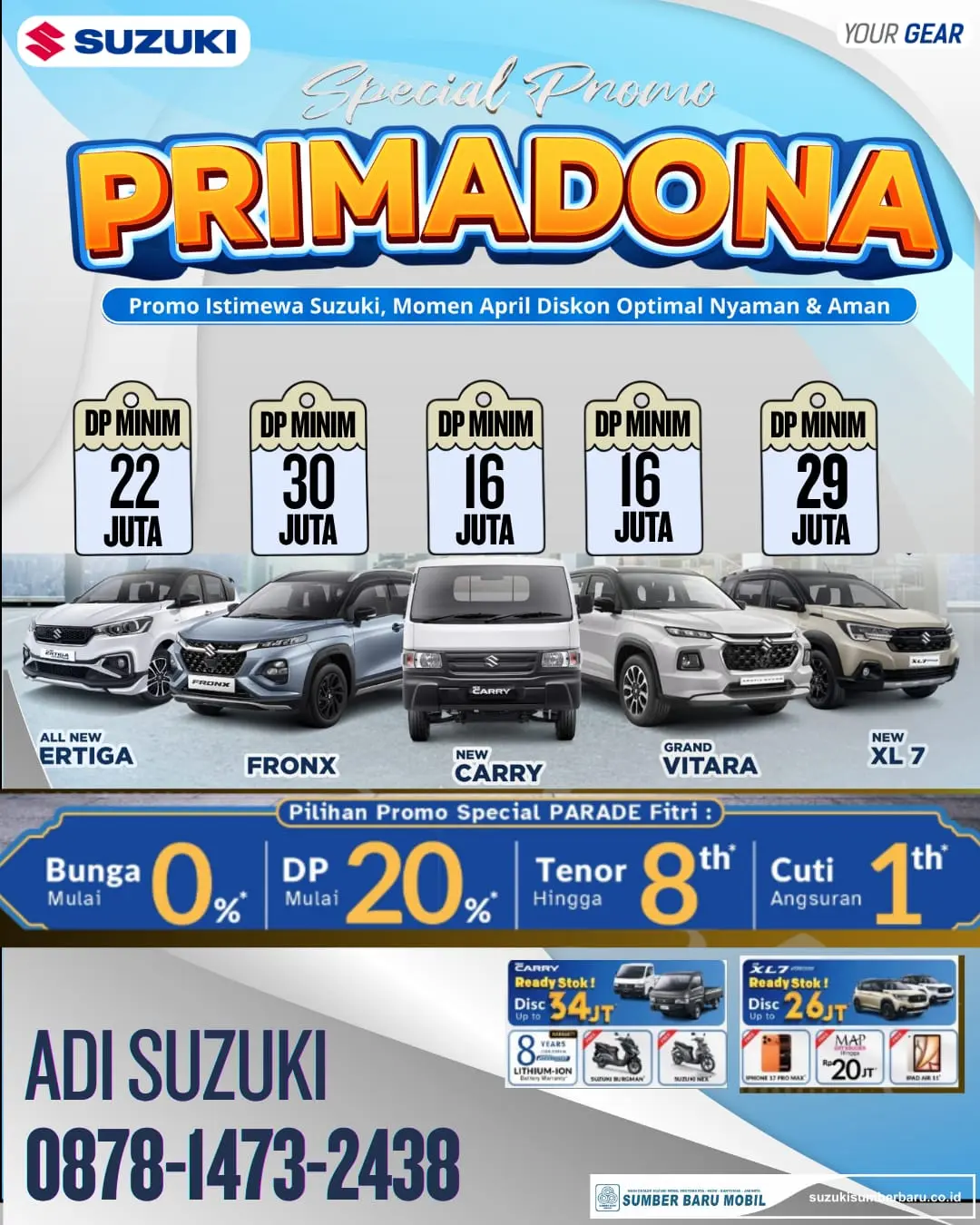 KROYA – Menjelang momen mudik dan perayaan Idul Fitri, Suzuki Sumber Baru Mobil Kroya resmi meluncurkan program "Promo PRIMADONA" (Promo Istimewa Suzuki, Momen April Diskon Optimal Nyaman & Aman). Program ini menawarkan kemudahan luar biasa bagi warga Kroya dan sekitarnya untuk memiliki mobil baru dengan skema pembiayaan yang sangat ringan.