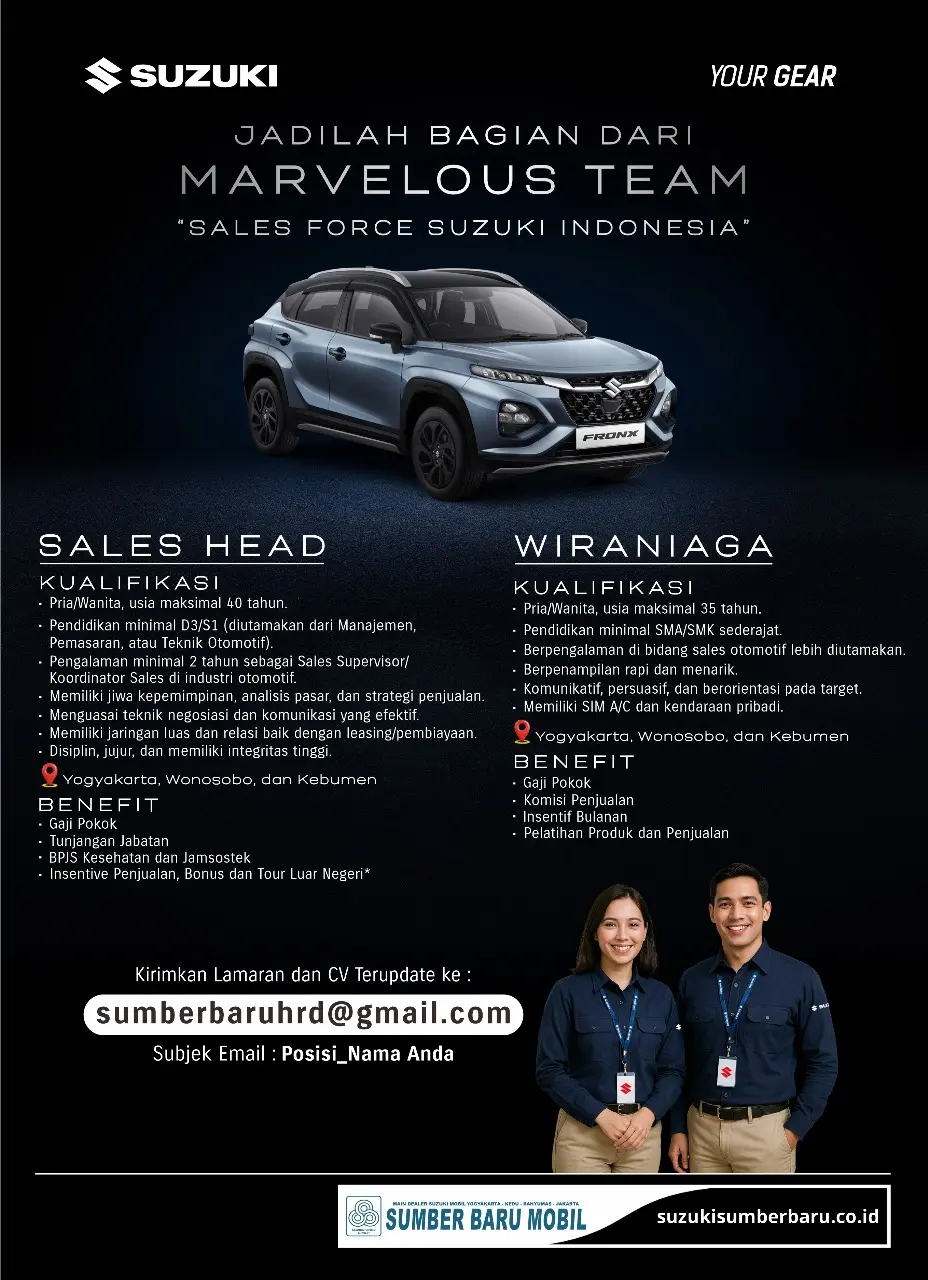 Yogyakarta – September 2025 Suzuki Sumber Baru Mobil, dealer resmi Suzuki di wilayah Yogyakarta, Kedu, dan sekitarnya, kembali membuka kesempatan berkarir bagi talenta muda yang ingin berkembang di dunia otomotif. Melalui program rekrutmen bertajuk “Marvelous Team – Sales Force Suzuki Indonesia”, Suzuki menghadirkan peluang kerja untuk dua posisi strategis, yakni Sales Head dan Wiraniaga.