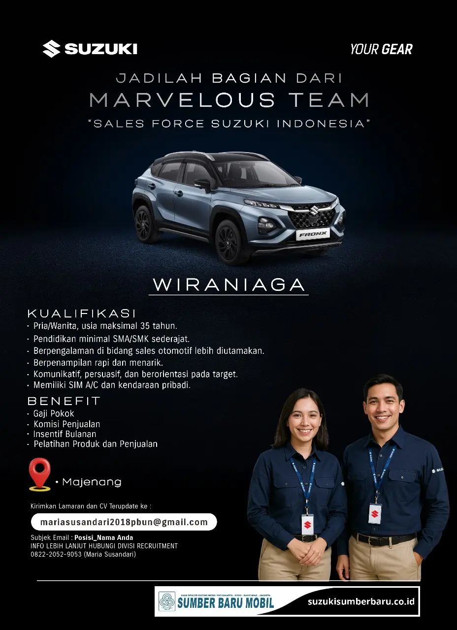 Majenang – Suzuki Sumber Baru Mobil kembali membuka kesempatan berkarier bagi generasi muda yang penuh semangat dan siap berkembang di dunia otomotif. Kali ini, lowongan kerja dibuka untuk posisi Wiraniaga (Sales Force Suzuki Indonesia) yang akan ditempatkan di cabang Majenang.