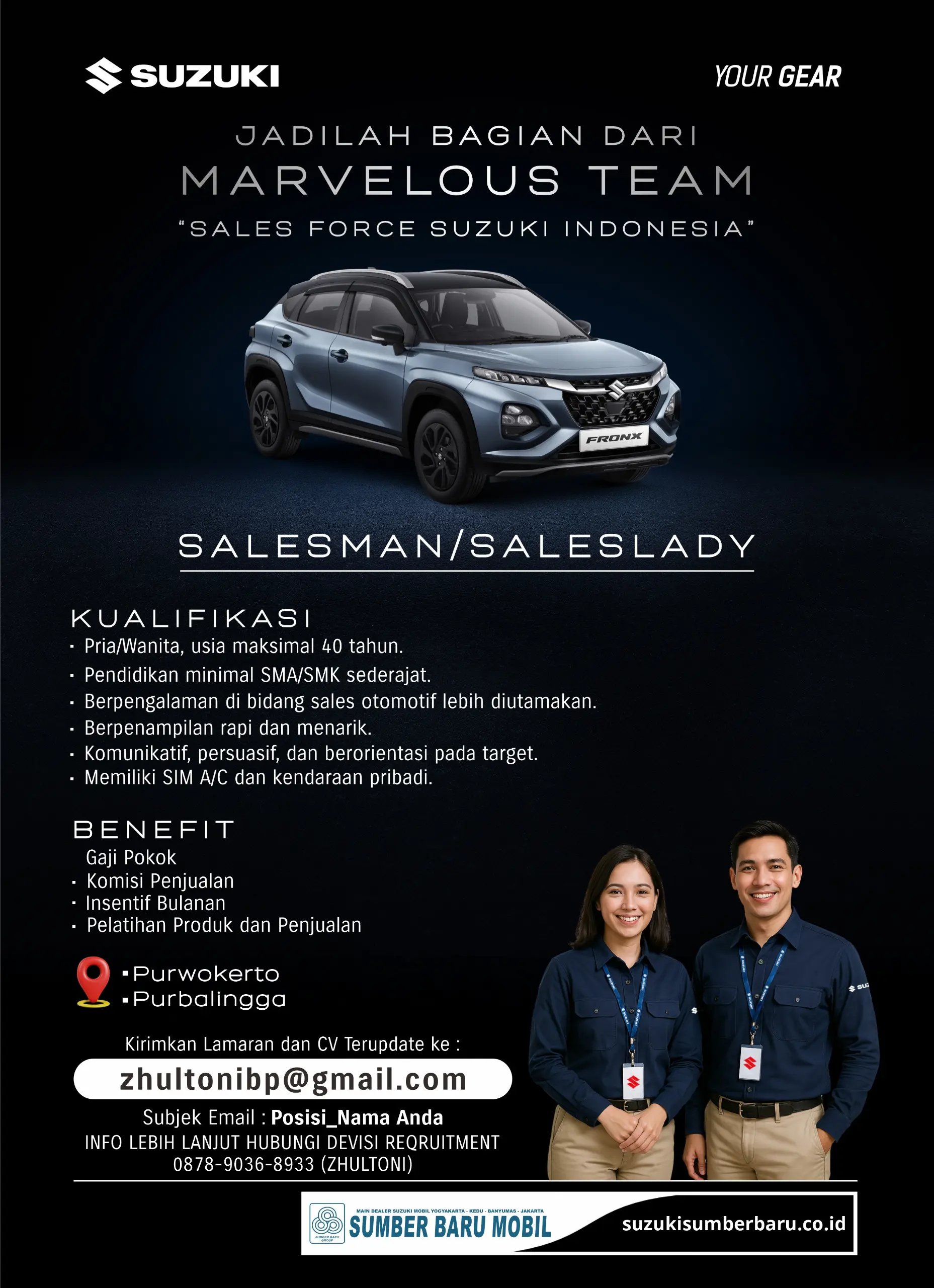 Suzuki Sumber Baru Mobil Buka Lowongan Salesman & Saleslady untuk Area Purwokerto dan Purbalingga