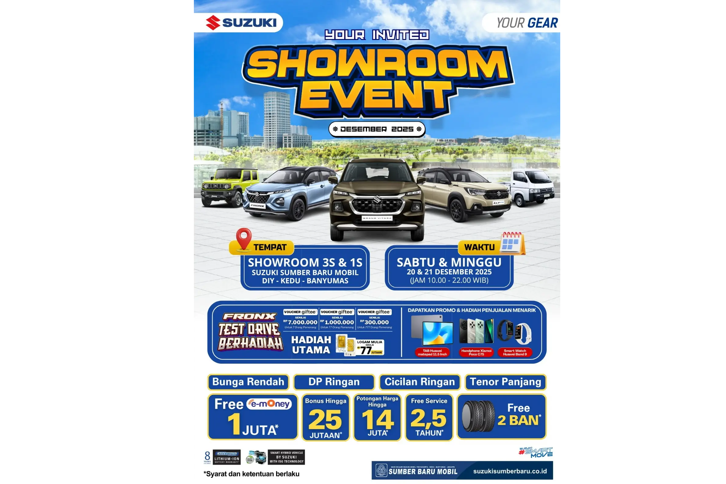 Promo ini berlaku khusus selama bulan April 2025, dan tersedia di seluruh jaringan Suzuki Sumber Baru Mobil yang melayani area Yogyakarta, Kedu, Banyumas, Cilacap, Banjarnegara, Kebumen, Purworejo, Wonosobo, Magelang, Sleman, Bantul, hingga Wonosari.