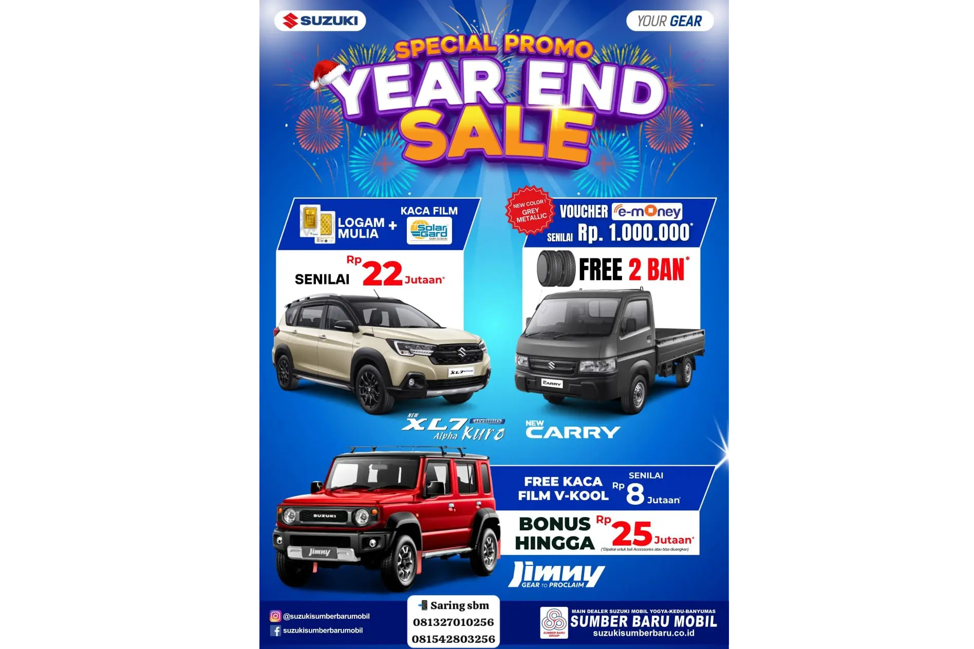 Yogyakarta – Menutup tahun 2025, Suzuki kembali menghadirkan program spektakuler YEAR END SALE 2025, sebuah promo akhir tahun yang menawarkan berbagai keuntungan spesial bagi masyarakat yang ingin memiliki mobil baru. Berlangsung secara nasional, program ini menjadi salah satu momen paling ditunggu oleh pelanggan setia Suzuki.