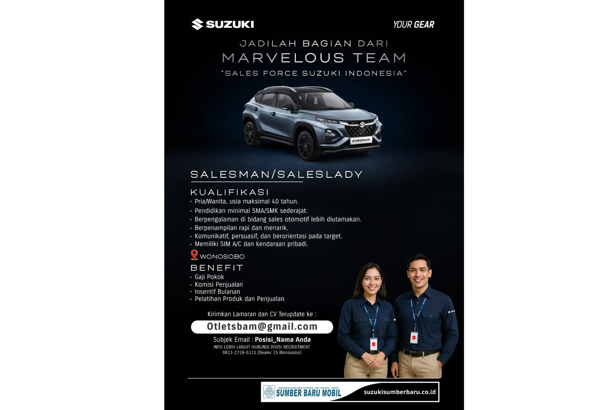 Dicari Pria & Wanita Usia Max 40 Tahun! Gabung Sales Force Suzuki Sumber Baru Mobil: Dapat Gaji Pokok, Komisi, dan Pelatihan Resmi.
