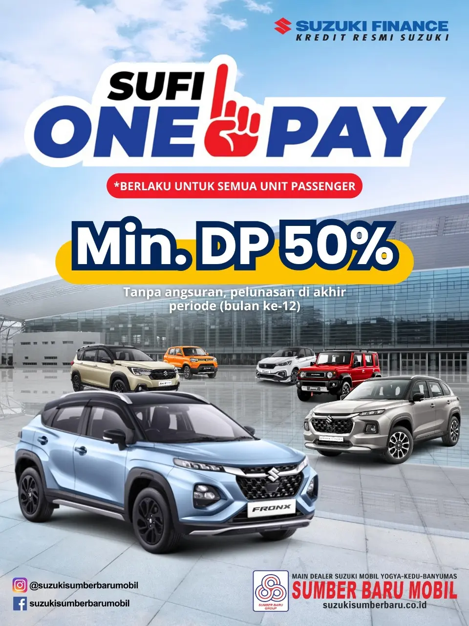 Program S.U.F.I One Pay adalah solusi pembiayaan cerdas yang tidak bisa Anda lewatkan. Segera kunjungi Dealer Suzuki Sumber Baru Mobil terdekat atau hubungi marketing kami untuk mendapatkan informasi lebih detail. Kunjungi juga website resmi kami di https://suzukisumberbaru.co.id/.