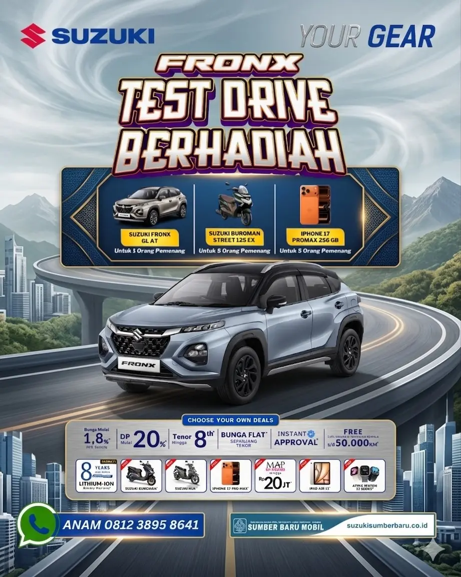 Buruan daftar test drive sekarang, klik 👉 https://suzukisumberbaru.co.id/ atau chat WA 081238958641. Jangan sampai hadiah iPhone 17 dan GLAT Street125EX dibawa orang lain.