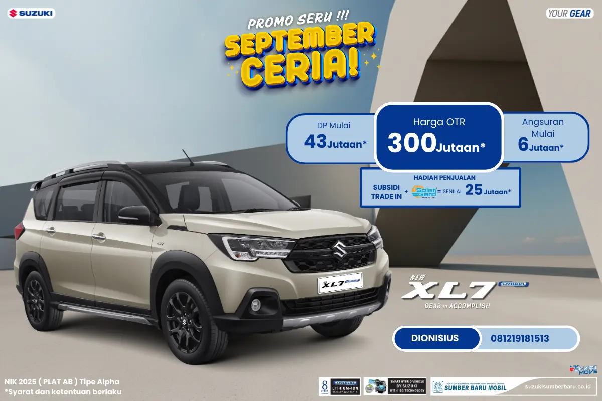 Suzuki Sumber Baru Mobil Mlati kembali hadir dengan Promo September Ceria untuk Suzuki XL7 Hybrid, pilihan tepat bagi pria dan wanita usia 25-65+ yang menginginkan mobil stylish, irit, dan nyaman. Promo ini menawarkan DP mulai 43 Jutaan dengan cicilan ringan mulai 6 Jutaan, harga On The Road mulai 300 Jutaan* saja!