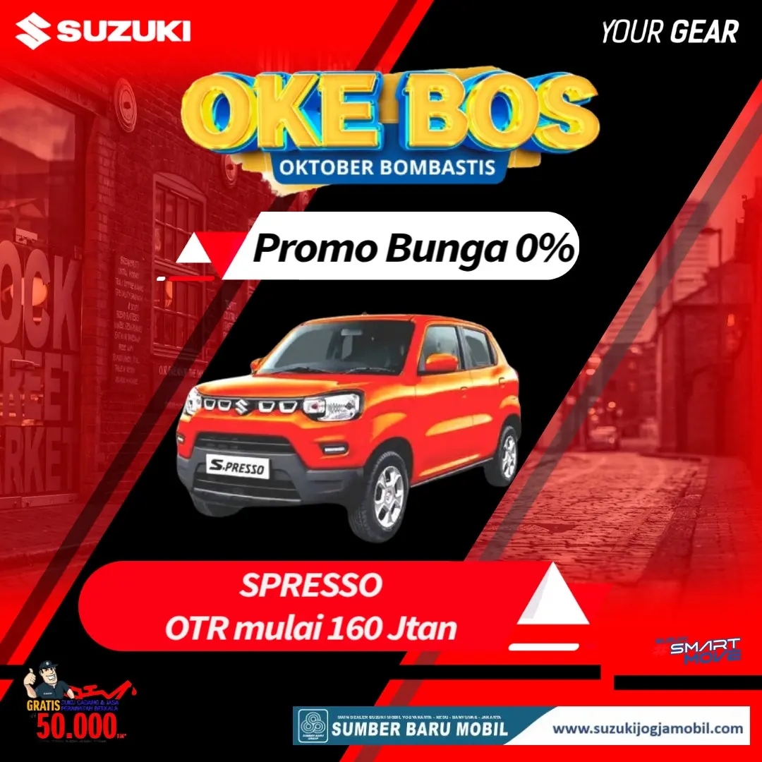 Bayangkan Anda bisa memiliki mobil baru yang stylish dan irit, namun cicilannya terasa seperti membeli tunai. Mustahil? Tidak lagi! Khusus di bulan ini, Anda bisa membawa pulang city car a la SUV, Suzuki S-Presso, dengan PROMO BUNGA 0%. Ini adalah cara paling cerdas (#SmartMove) untuk memiliki mobil pribadi tanpa harus "membakar" uang untuk biaya bunga.