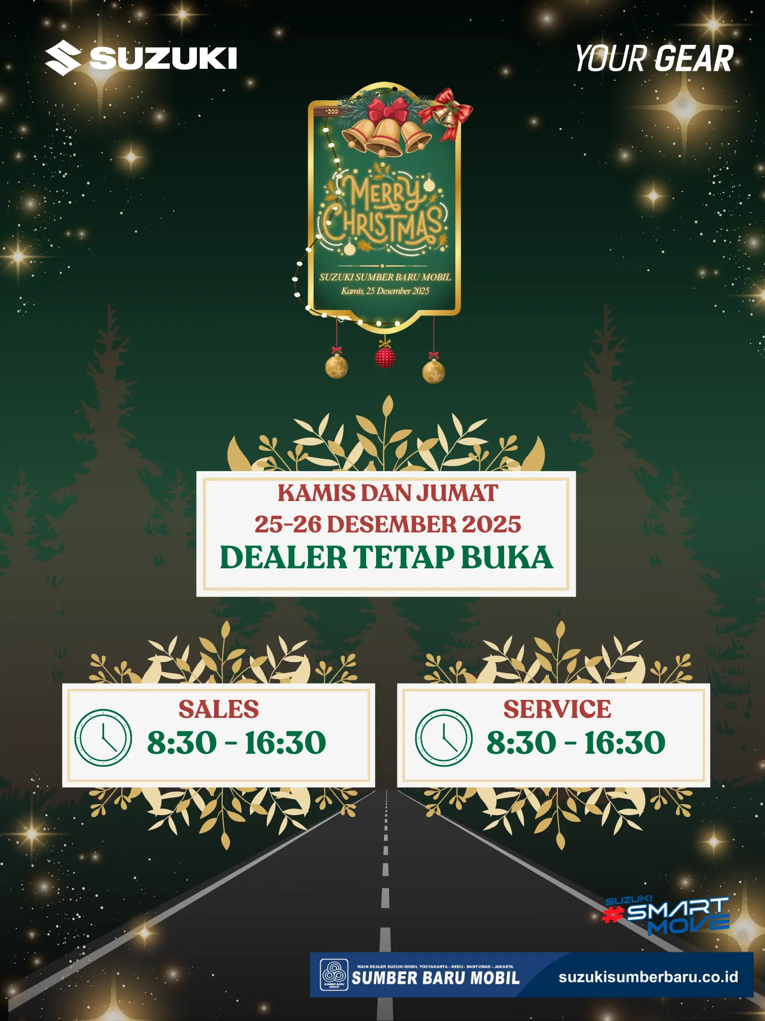 Melalui rilis resmi yang diterima redaksi, Suzuki Sumber Baru Mobil menegaskan komitmennya untuk mendukung mobilitas masyarakat selama masa liburan. Dealer secara resmi menyatakan "DEALER TETAP BUKA" pada hari Kamis dan Jumat, 25-26 Desember 2025.