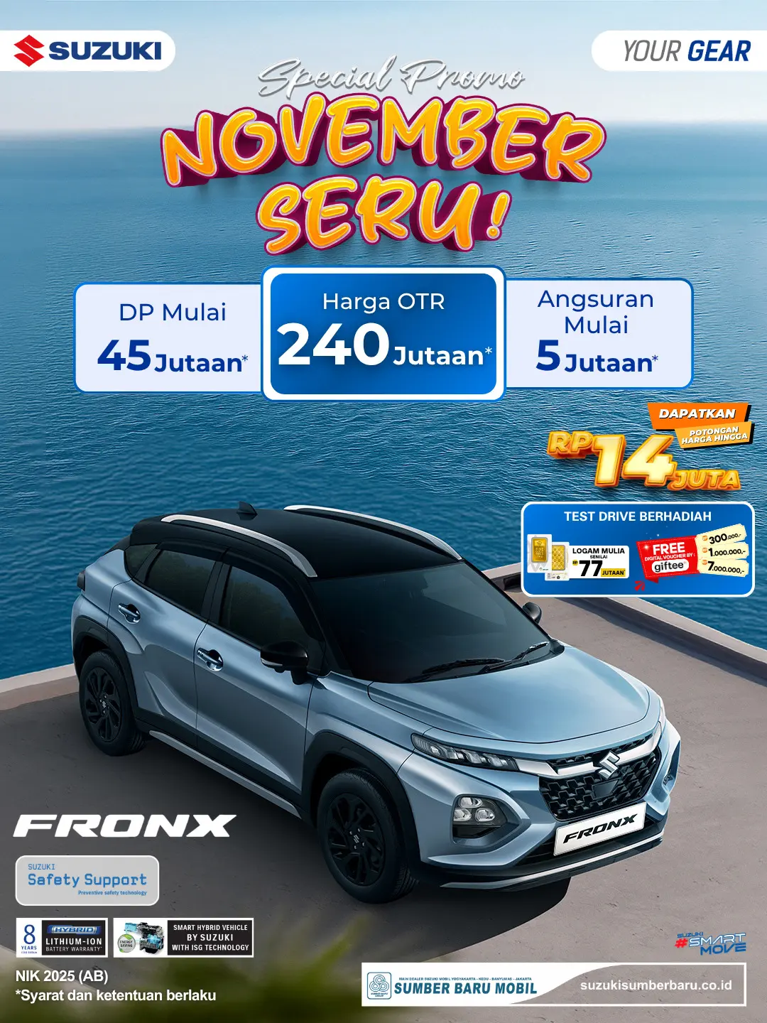 "Saya kira Crossover Hybrid secanggih Fronx (yang ada ADAS-nya) itu harganya pasti di atas 300 juta. Pas saya lihat promo 'November Seru' di Suzuki Sumber Baru Bantul, OTR-nya mulai 240 jutaan, masih dapat diskon 14 juta lagi! DP 45 juta angsuran 5 jutaan sangat masuk akal. Saya langsung daftar test drive, siapa tahu dapat emas 7 juta-nya!"