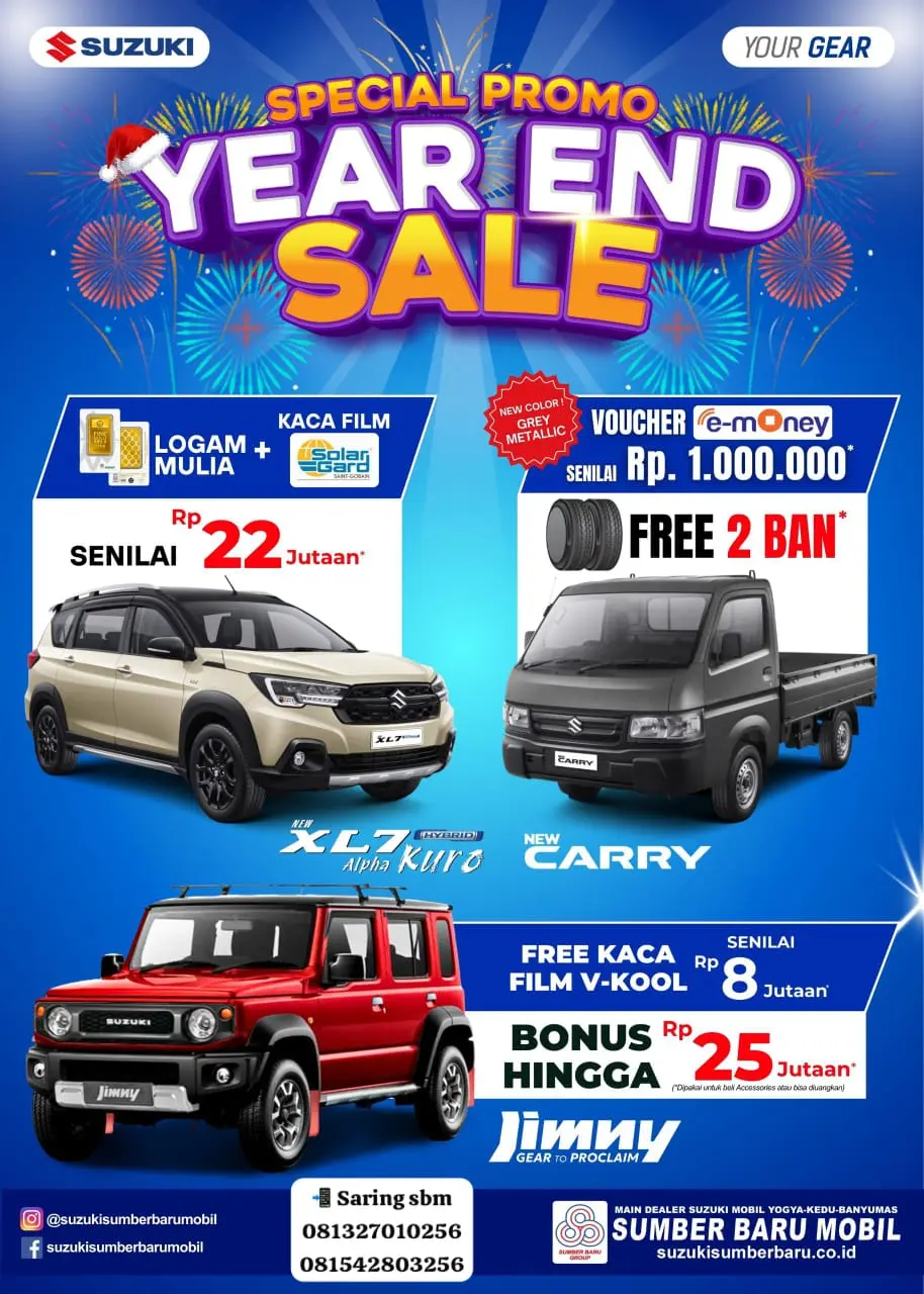 BANYUMAS – Kabar gembira menyapa warga Banyumas dan sekitarnya. Menutup tahun 2025, Suzuki Sumber Baru Mobil menggelar pesta promo besar-besaran bertajuk "Year End Sale". Momen ini menjadi kesempatan langka bagi "Wong Banyumas" untuk membawa pulang mobil baru dengan segudang hadiah mewah, mulai dari emas murni hingga uang elektronik jutaan rupiah.