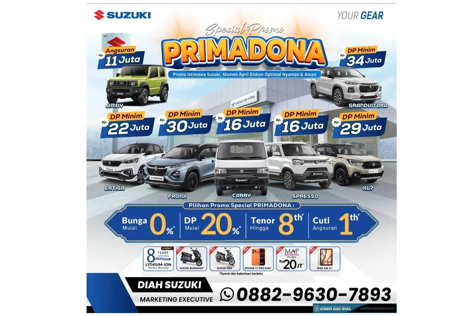 CILACAP – Memasuki pertengahan bulan April, Suzuki Sumber Baru Mobil Cilacap resmi meluncurkan program promo besar-besaran bertajuk "PRIMADONA" (Promo Istimewa Suzuki, Momen April Diskon Optimal Nyaman & Aman). Program ini dirancang khusus untuk memudahkan warga Cilacap dan sekitarnya memiliki mobil impian dengan skema pembiayaan yang sangat ringan.